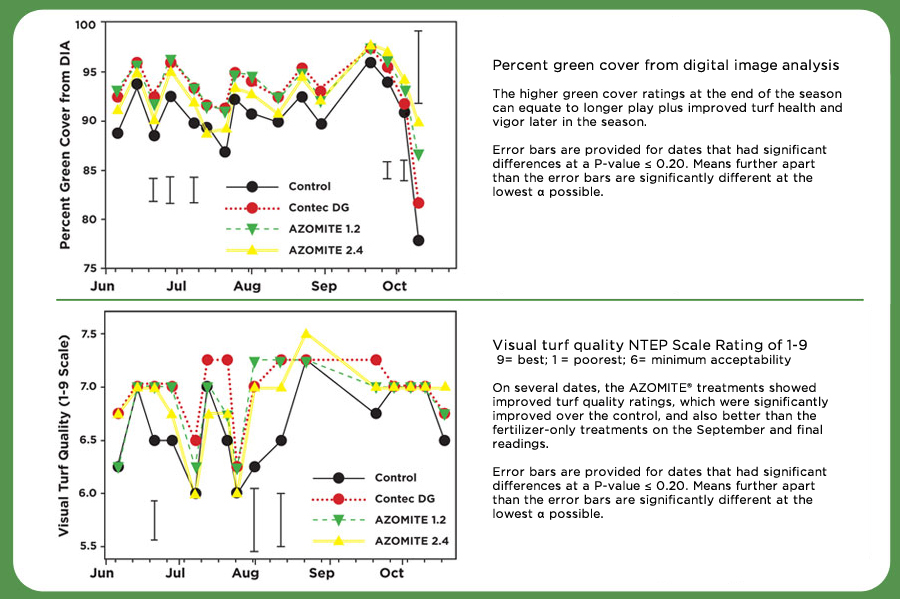 A Replicated Completely Randomized Block Design (CRBD) research study, was conducted by Dr. Joey Young, assistant professor of turfgrass science at Texas Tech University on The Rawls Golf Course in Lubbock, TX in 2016 on an established “TifSport” hybrid Bermuda grass fairway. All plots received soluble fertilizer (20-5-25) at 1 lb/1,000 ft2 and PolyonTM (CR 20-0-20) at 1 lb/1,000 ft2 in early spring. The control plots received no other fertilizer through the growing season. The fertilizer-only plots received Contec DGTM (18-9-18) at 1 lb/1,000 ft2 in early June, and the AZOMITE® plots received the same rate of Contec DG plus 1.2 lb/1,000 ft2 of AZOMITE or 2.4 lb/1,000 ft2 of AZOMITE® at the same time. Soil tests and clipping analysis were conducted several times during the season. Visual turf ratings, light box digital imagery and NDVI instrument readings were used to produce ratio vegetation index (RVI) and spectral reflectance data. At the end of the season, root cores were taken from each plot and washed and dried —
