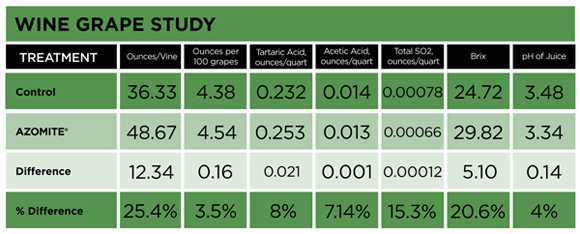 Initial and follow-up wine organolleptic tests reported wine made from AZOMITE® test grapes was significantly better than wine from control grapes in terms of flavor, mouthfeel and aftertaste.