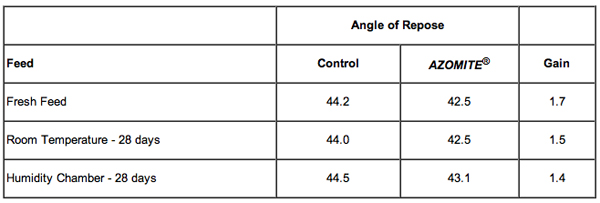 This 12 replication study was completed using micronized AZOMITE® at 1% of the total feed mix in a pig starter ration. The angle of repose of each feed was measured with the theory that a product with a low angle of repose will have a better flowability than a product with a high angle of repose. The angle of repose was determined by pouring 2400 ml samples of feed through a funnel suspended 25cm above the bench top. The angle between the pile and bench measured at 4 locations was averaged to secure one measurement and 12 samples of each feed were measured. The test was performed three times with fresh feed, feed stored 28 days at room temperature, and feed stored 28 days in a humidity chamber at 80o F and 70% humidity.