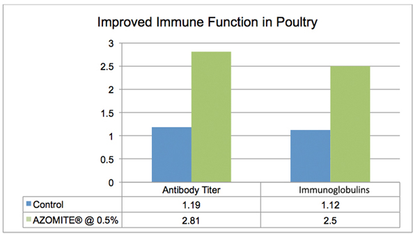 Mark Cook, Ph.D. was research study director. AZOMITE® trace minerals were added at 0.5% to the feed of sixteen test chickens and sand was added to the feed of sixteen control chickens. The chickens were all injected with sheep red blood cells to challenge the chickens, and six days later at 22 days of age blood was drawn and the antibody titer and immunoglobulin levels were measured.