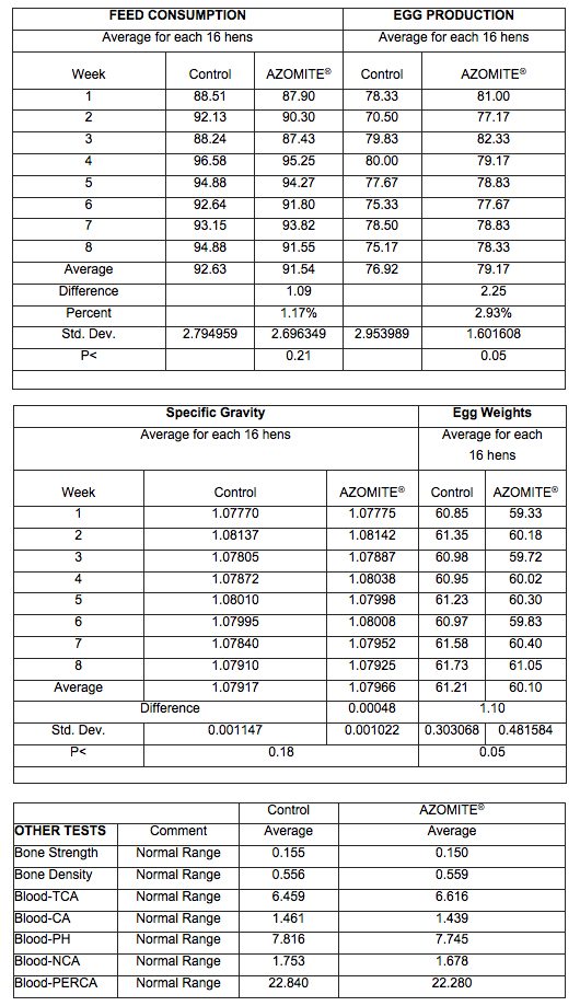 Completed at Auburn University under the direction of Dr.David A. Roland, Sr. in February 1995. Eight one week replications with each replication consisting of 6 pens of 16 control hens and 6 pens of 16 test hens withAZOMITE® added at 0.5% to the diets of the 96 test hens.