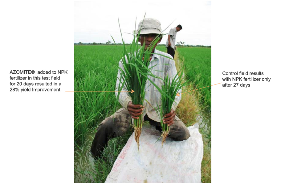 This Rice Paddy trial, (December, 2005) in South Sulawesi, Indonesia compared AZOMITE® added to a standard NPK fertilizer program for 20 days (left) and a control test, solely NPK without AZOMITE® (right) for 28 days.