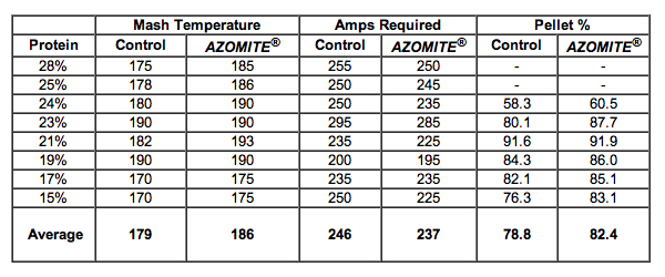 The following study was completed at a 5 ton batch mill adding micronized AZOMITE® at 1% of the total feed mix.