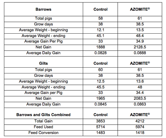 15 pigs per pen; AZOMITE® added at 0.5%. Completed by a major US swine producer.